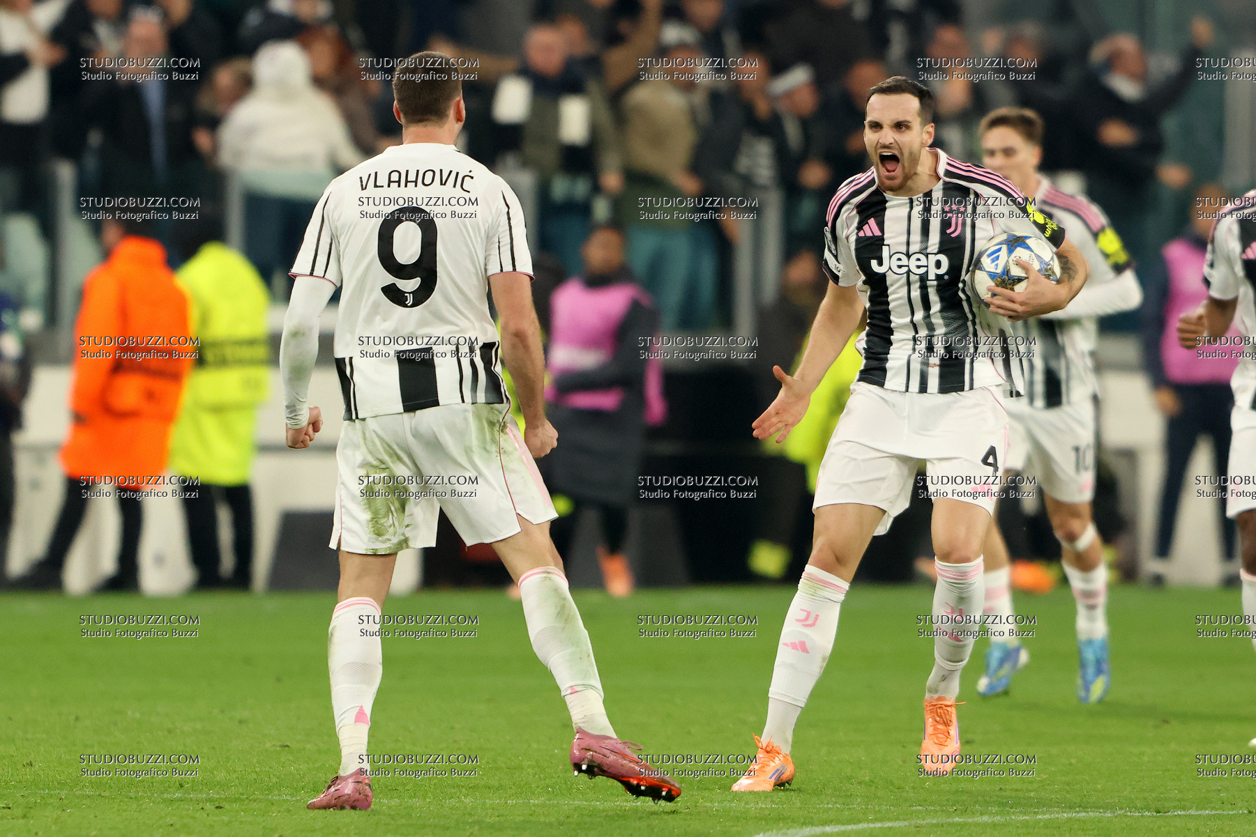 DUSAN VLAHOVIC, FEDERICO GATTI, Juventus, Champions League, 2025-26, Juventus vs Sporting Lisboa 1-1, 04-11-2025, Esultanza, Celebration, Jubel