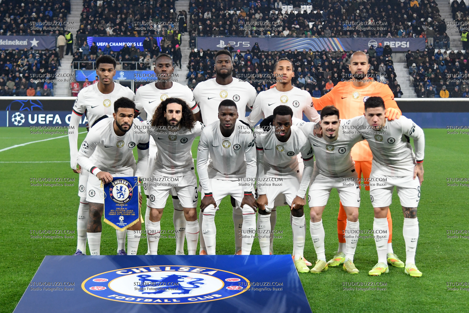 CHELSEA SQUADRA, TEAM GROUP, LINE UP, MANNSCHAFT: JOSHUA ACHEAMPONG, TREVOH CHALOBAH, BENOIT BADIASHILE, JOAO PEDRO, ROBERT SANCHEZ; REECE JAMES, MARC CUCURELLA, MOISES CAICEDO, JAMIE GITTENS, PEDRO NETO, ENZO FERNANDEZ. Chelsea, Champions League 2025-26, Atalanta-Chelsea 2-1, posa