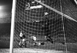 Evento: Coppa uefa semi finale ritorno milan-tottenham h 1-1; Argomento: Calcio; Periodo: 1971/72; Categoria: MILAN - TOTTENHAM HOTSPUR; Soggetto: FABIO CUDICINI; Nazione: Studio Buzzi; Descrizione: CONTRASTO; Luogo: STADIO; Città: MILANO;