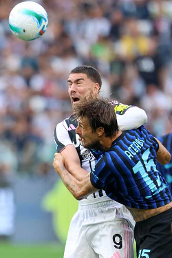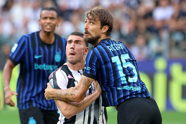 DUSAN VLAHOVIC, Juventus, FRANCESCO ACERBI, Inter, Serie A, 2025-26, Juventus vs Intar 4-3, 13-09-2025, Contrasto, Action